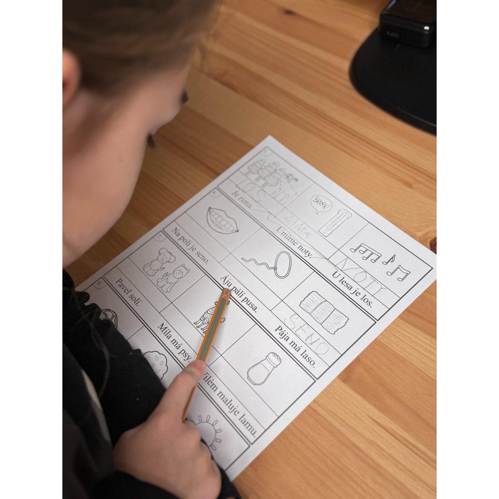 Děti čtou věty, přiřazují k nim odpovídající obrázky a postupně si upevňují porozumění textu. Součástí je také čtenářské loto, díky kterému se čtení mění v hravou aktivitu a děti si procvičují porozumění přirozeně, bez drilu.