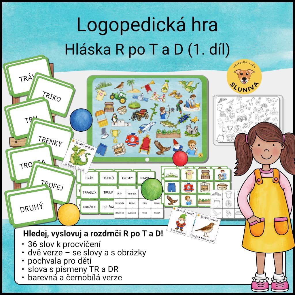 Logopedická hra je vhodná pro domácí procvičování, práci ve škole i při logopedické intervenci. Pomáhá při vyvozování i upevňování hlásky R po T a D. Lze ji zařadit jako krátkou aktivitu do hodiny i jako delší systematický trénink.