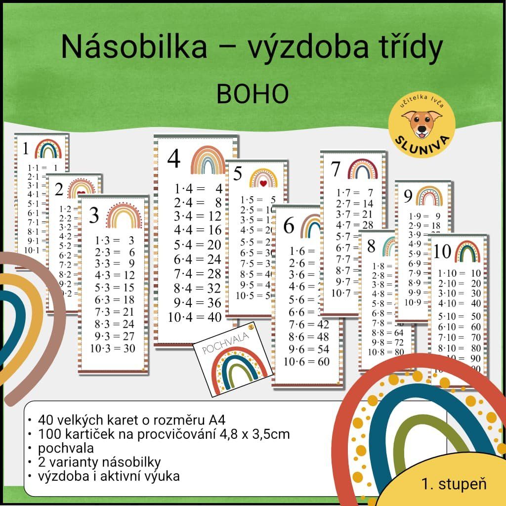 Boho násobilka spojuje estetiku třídy s funkčním učením. Nejde jen o plakát na zeď, ale o prostor, kde děti aktivně pracují s příklady.