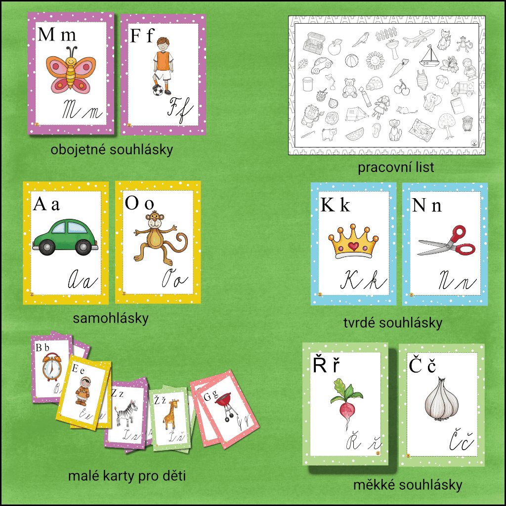 Puntíkatá abeceda propojuje vizuální přehled s aktivní prací. Velké plakáty (A4) tvoří základ výzdoby, menší karty (A5) i hrací kartičky umožňují dětem manipulaci s písmeny a různá třídicí či skládací cvičení.