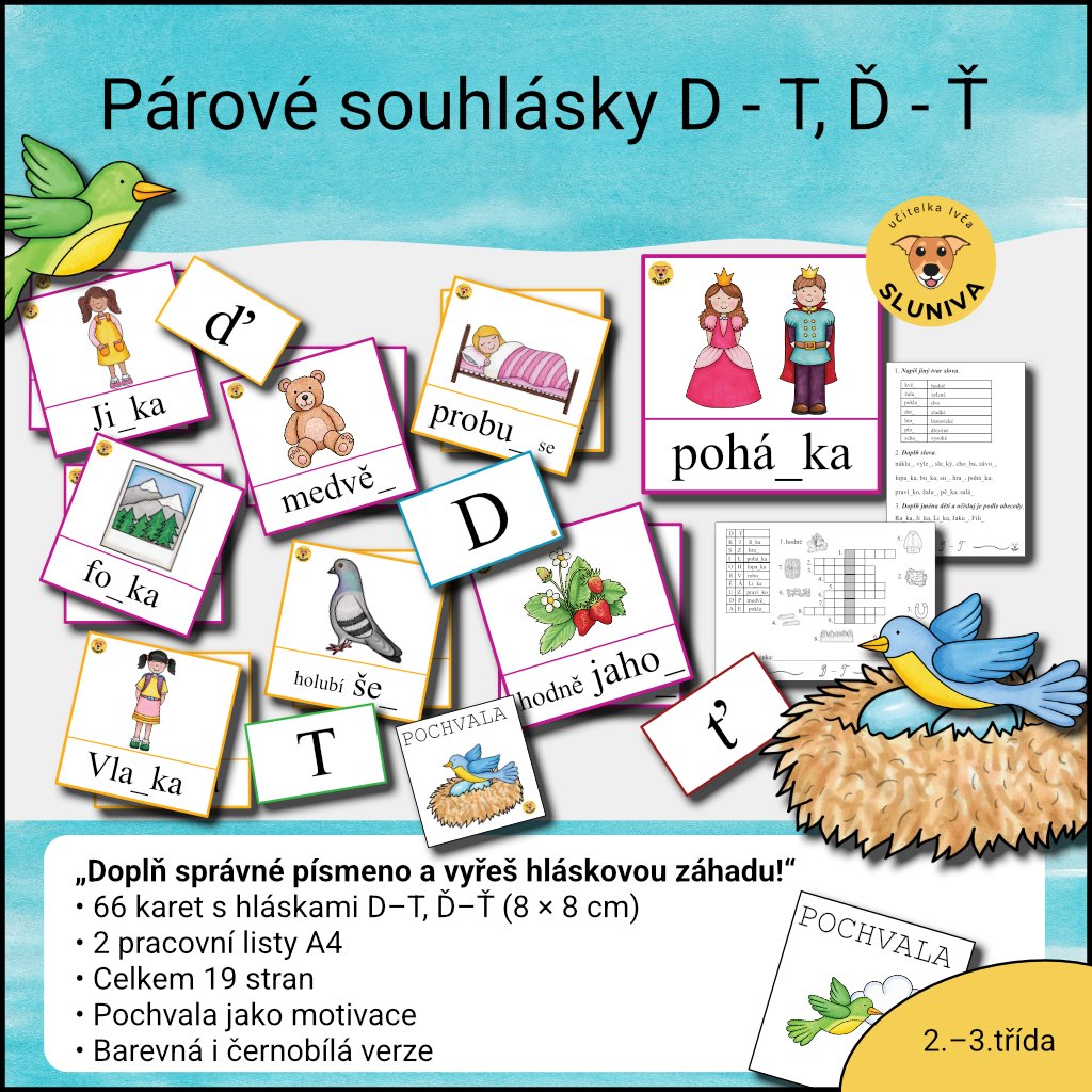 - 4 velké třídicí karty s písmeny D, T, Ď, Ť