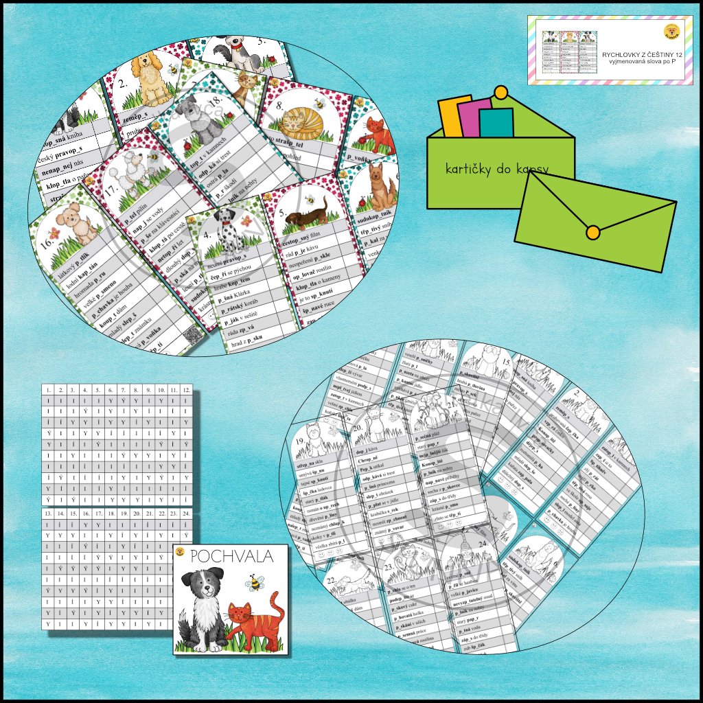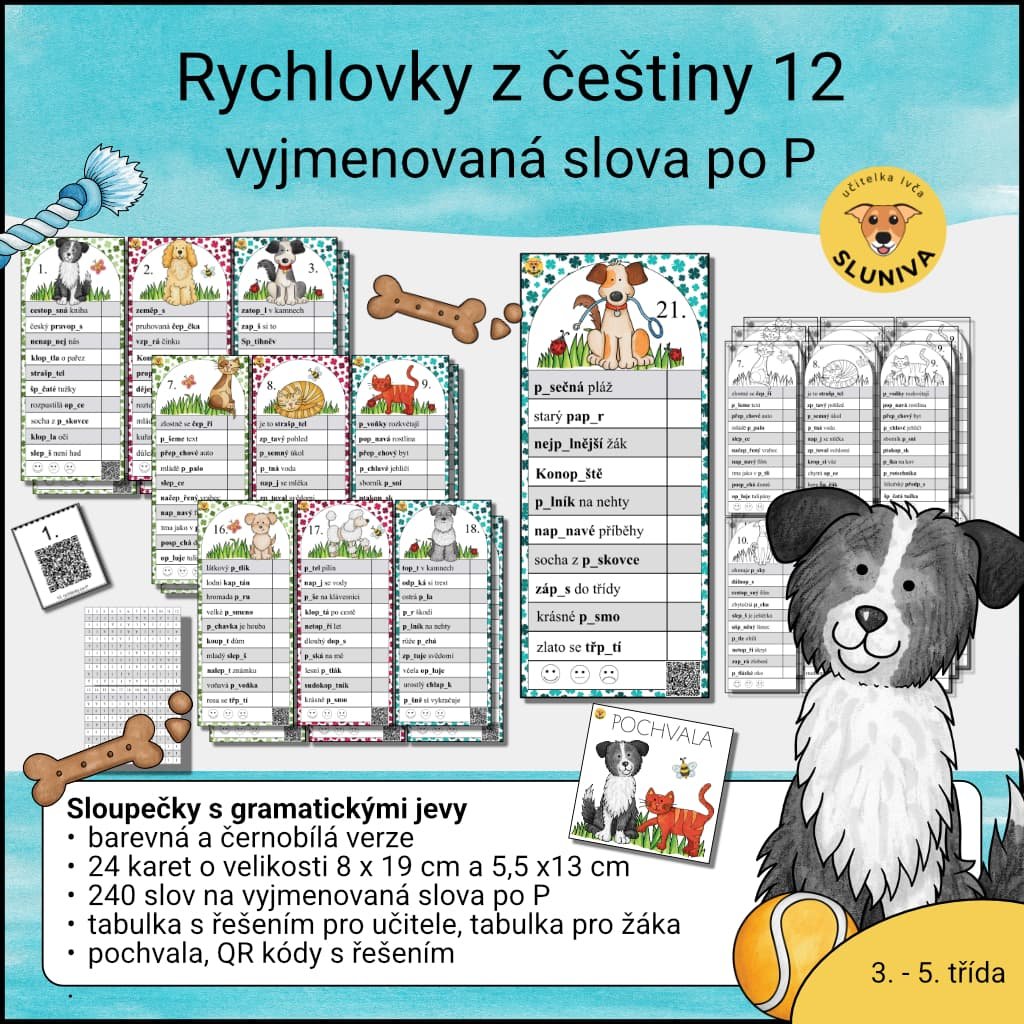 Jsem balíček rychlovek, který tě naučí vyjmenovaná slova po P bez stresu a nudy. Díky přehledným kartám zvládneš psaní i doplňování hravou formou, bez dlouhého memorování. A když si nejsi jistý, pomůžou ti QR kódy nebo tabulka s řešením, kde snadno zjistíš správný výsledek.