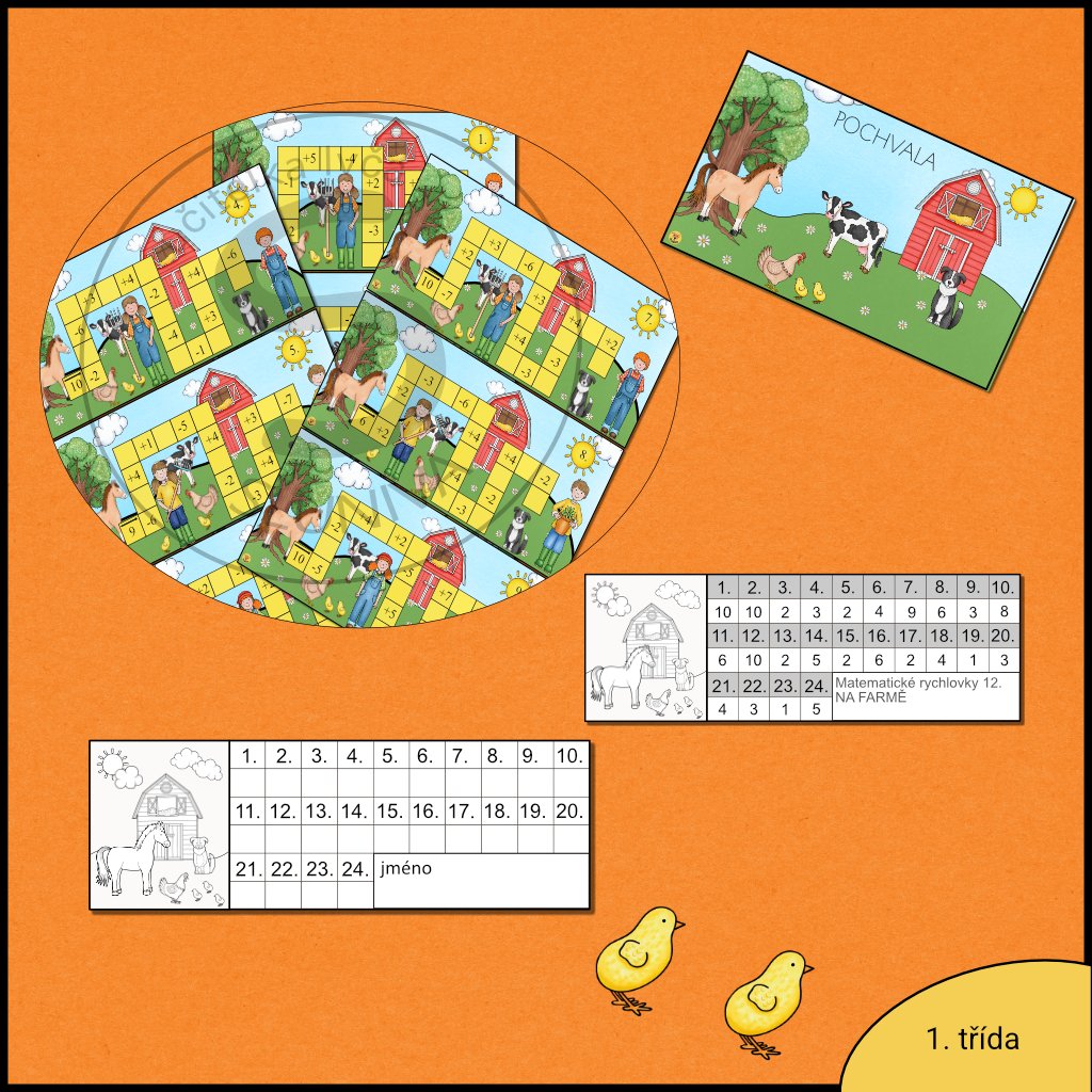 Jsem Matematická rychlovka – sada kartiček s příklady do 10, které spojuje motiv farmy. Děti mě využijí k rychlému procvičení sčítání a odčítání, a přitom se ponoří do světa zvířat, traktorů a stodol. Jsem ideální pro začátek nebo konec hodiny i na samostatnou práci.