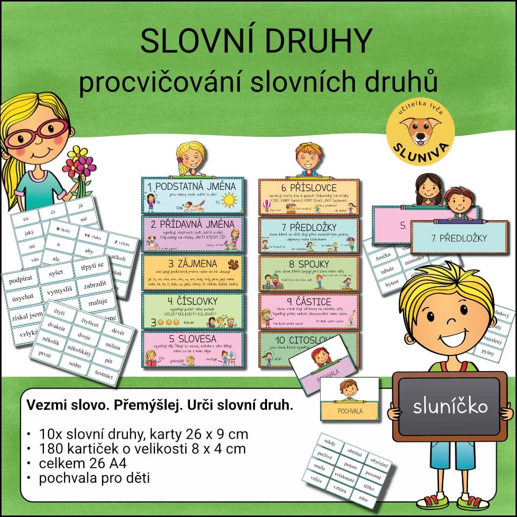 - 10 velkých karet se všemi slovními druhy