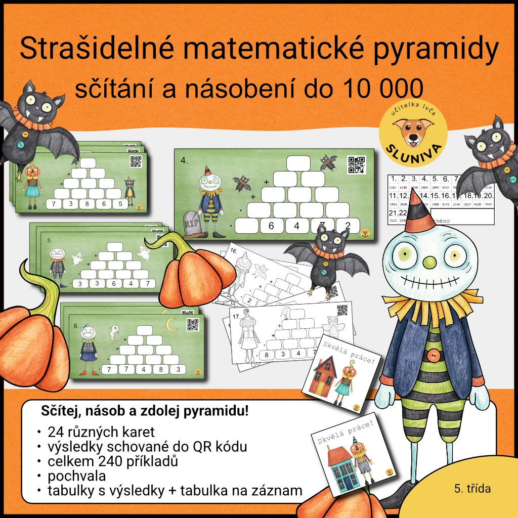 Jsem halloweenská sada, která promění počítání v zábavné dobrodružství. Každá pyramida ukrývá desítky příkladů, děti sčítají, násobí, přemýšlí a zjišťují, jak se čísla propojují. A když si nejsou jisté? QR kód jim prozradí výsledek!