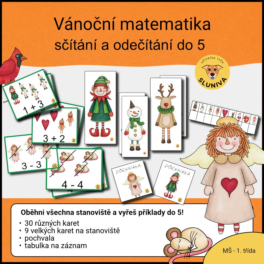 Proměním hodinu v hravou pohybovou matematiku. Děti obcházejí stanoviště, u každé vánoční ilustrace vyřeší sčítání nebo odčítání do 5 a výsledek zapíší do své tabulky. Všechno je přehledné, krátké a svižné – ideální do předvánočního období, kdy je energie ve třídě až až.